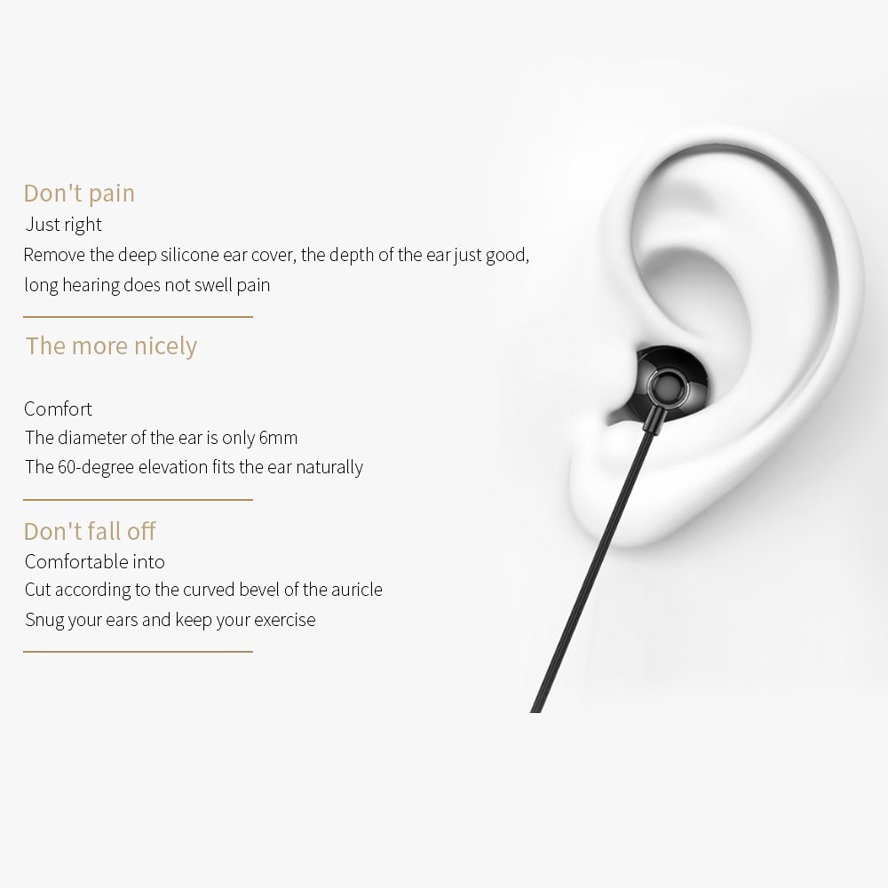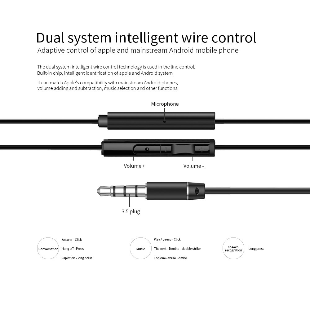 Diseño profesional: En el diámetro de la oreja de tan solo 6 mm,60 ° Ángulo de elevación natural fit oído; Control de cable inteligente: sistema dual puede inteligencia tecnología de control de alambre, Chip incorporado, reconocimiento inteligente de sistema de Apple Android, adaptar Apple compatible con teléfonos Android para controlar la suma y resta de volumen, selección de música y llamadas de respuesta.Algunos teléfonos Android no son perfectamente compatibles.