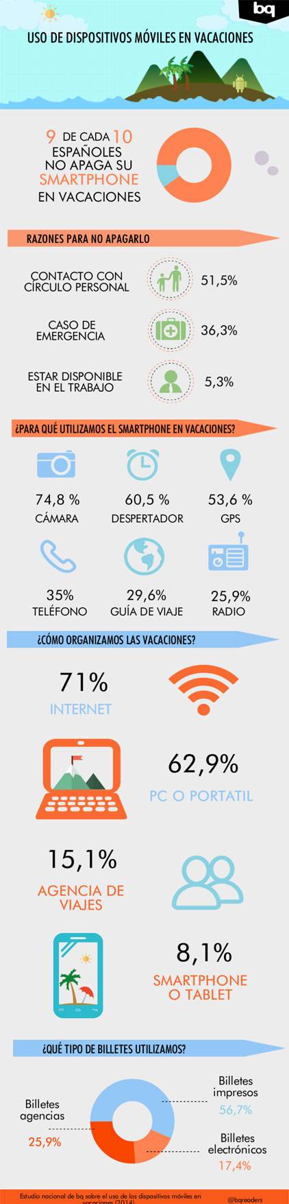 Tablets y smartphonesnos acompañan también durante nuestras vacaciones, por mucho que sean nuestros días de descanso para desconectar de todo. Así lo revela el primer estudio sobre hábitos de consumo de bq, la empresa española dedicada a la electrónica de consumo.