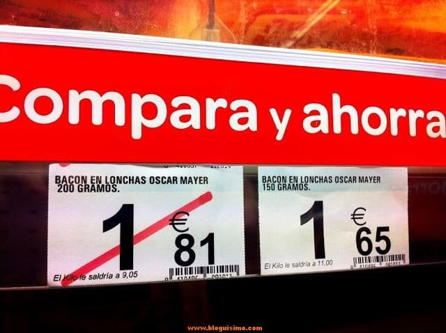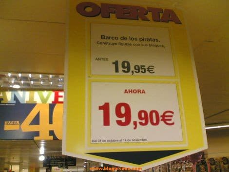 Engaña bobos (Controla el precio/Kg) Ofertón de El Corte Inglés Pedazo de promoción Diferente tamaño, mismo precio Pagas 4 te llevas 3 Superoferta, 5 cents de descuento :) Ahorra pagando 4 céntimos más No te lo vas a perder ahora: 0,25€ menos #yonosoytonto (uff y tanto!!) Mmm ¿Donde está la oferta? Otra promo: 4 cents más