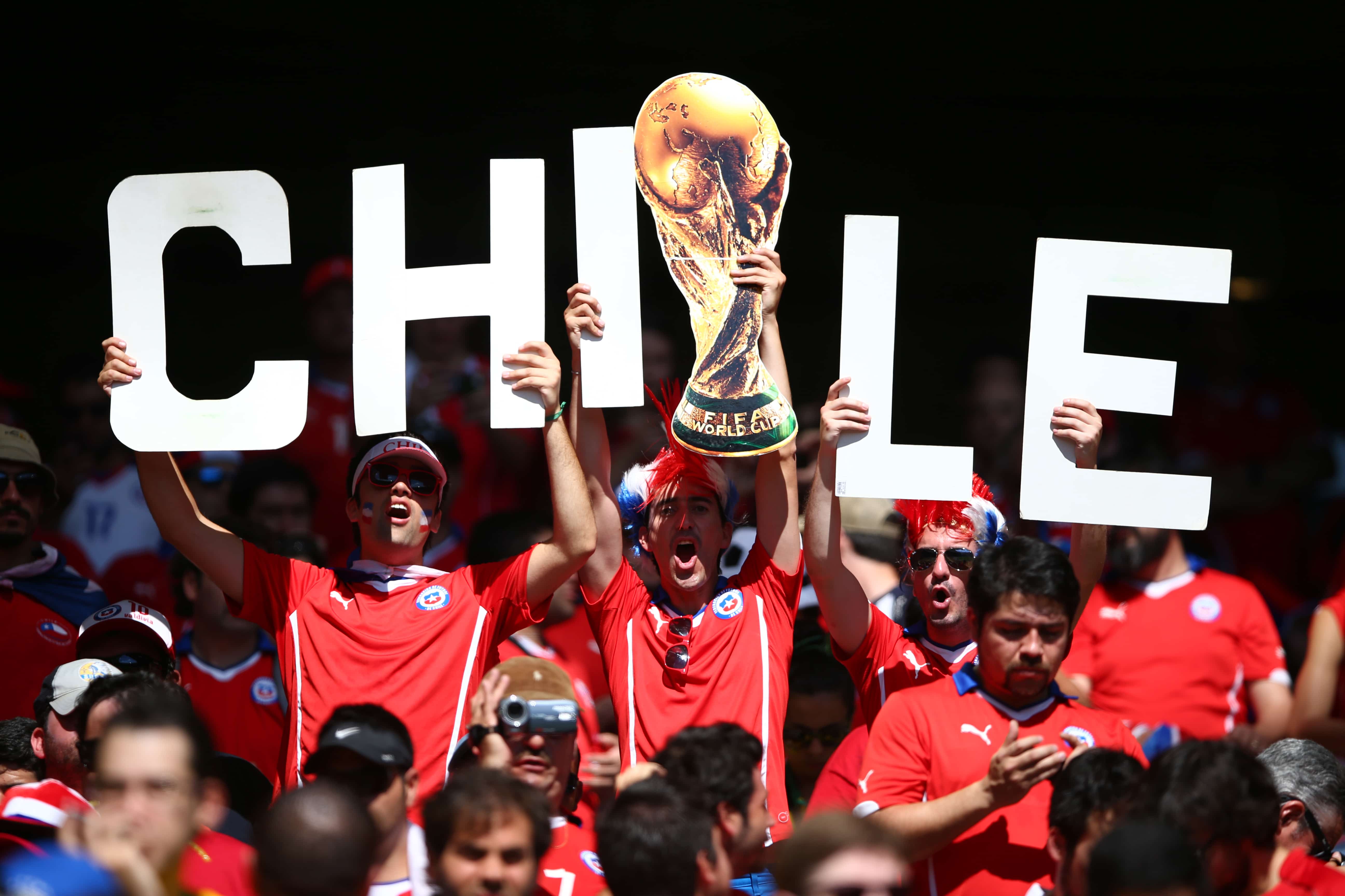 BELO HORIZONTE, BRAZIL - JUNE 28: Chile supporters cheer prior to the 2014 FIFA World Cup Brazil round of 16 match between Brazil and Chile at Estadio Mineirao on June 28, 2014 in Belo Horizonte, Brazil. (Photo by Paul Gilham/Getty Images for Sony)