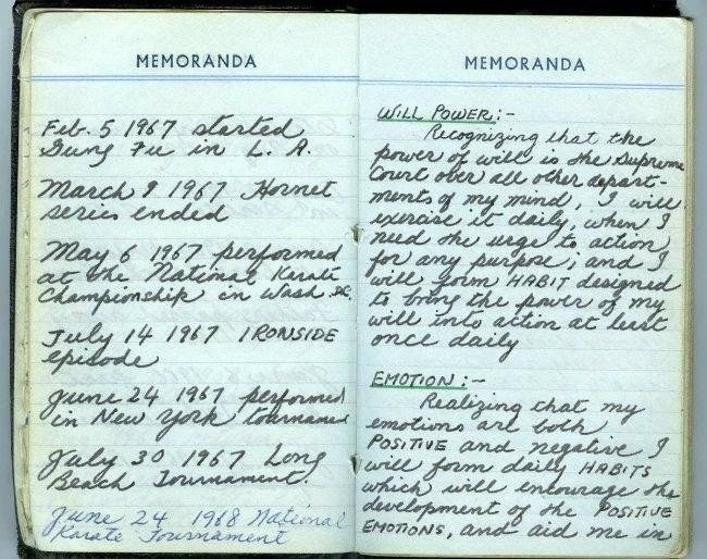 Bruce Lee llevaba siempre un cuaderno de notas en donde escribía pensamientos y registraba lo importante. Esas anotaciones fueron recuperadas hace poco tiempo, y salieron a la luz en los medios de comunicación.